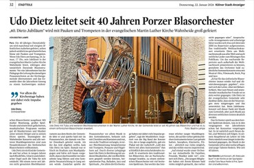 Ein 40-jähriges Dienstjubiläum wird manchmal mit einigem öffentlichen Aufsehen gefeiert, selten jedoch wirklich im sprichwörtlichen Sinne mit Pauken und Trompeten. Wenn Udo Dietz am Samstag, 24. Januar, 17 Uhr, sein Jubiläum in der evangelischen Martin Luther Kirche Wahnheide feiert, erklingen aber tatsächlich Dutzende Blasinstrumente. Vor vier Jahrzehnten hat der Pädagoge die Leitung des damaligen Posaunenchores an der Kirchengemeinde übernommen und das Ensemble über die Jahrzehnte hinweg zu einem hochwertigen sinfonischen Blasorchester ausgebaut. Mit starker Besetzung, großer Spielfreude und einem breit gefächerten, musikalischen Programm werden gut 40 Musikerinnen und Musiker unter seinem Dirigat und zu seinen Ehren spielen. Stammgäste der Wahnheider Konzerte und alle weiteren Musikbegeisterten sind zum Neujahrskonzert des Sinfonischen Blasorchesters willkommen.