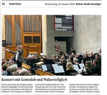 Als freudestrahlender Dirigent seinesbestens aufgelegten Sinfonischen Blasorchesters ermunterte Udo Dietz das Publikum in der Zugabe zum Mitklatschen beim Radetzky-Marsch. Das Neujahrskonzert zur Feier seines 40. Dienstjubiläums als nebenamtlicher Kirchenmusiker in Wahn-Heide gestaltete Udo Dietz mit einem begeisternden musikalischen Bogen von Stücken zum Gotteslob bis zur Wal-zerseligkeit. (bl/Foto: Beatrix Lampe)